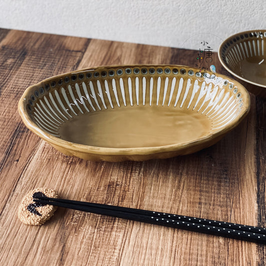 小糖瓷|日本製 日峰 六魯風菊割橢圓長盤/盛菜盤/咖哩盤/餐盤