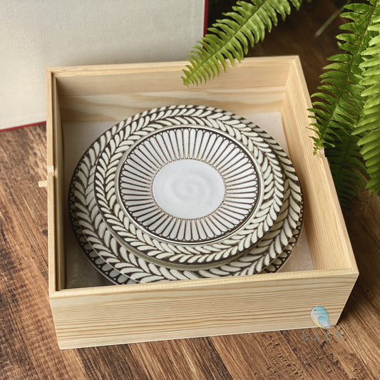小糖瓷|日本製 [預購/限量] 粉引菊割葉紋盤四入組禮盒/附牛皮紙提袋